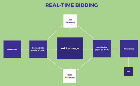 Auction process: When a user visits a webpage with available ad space, the ad exchange holds an auction to determine which ad to display. Advertisers compete for the ad space by placing bids based on their targeting criteria and campaign budget.